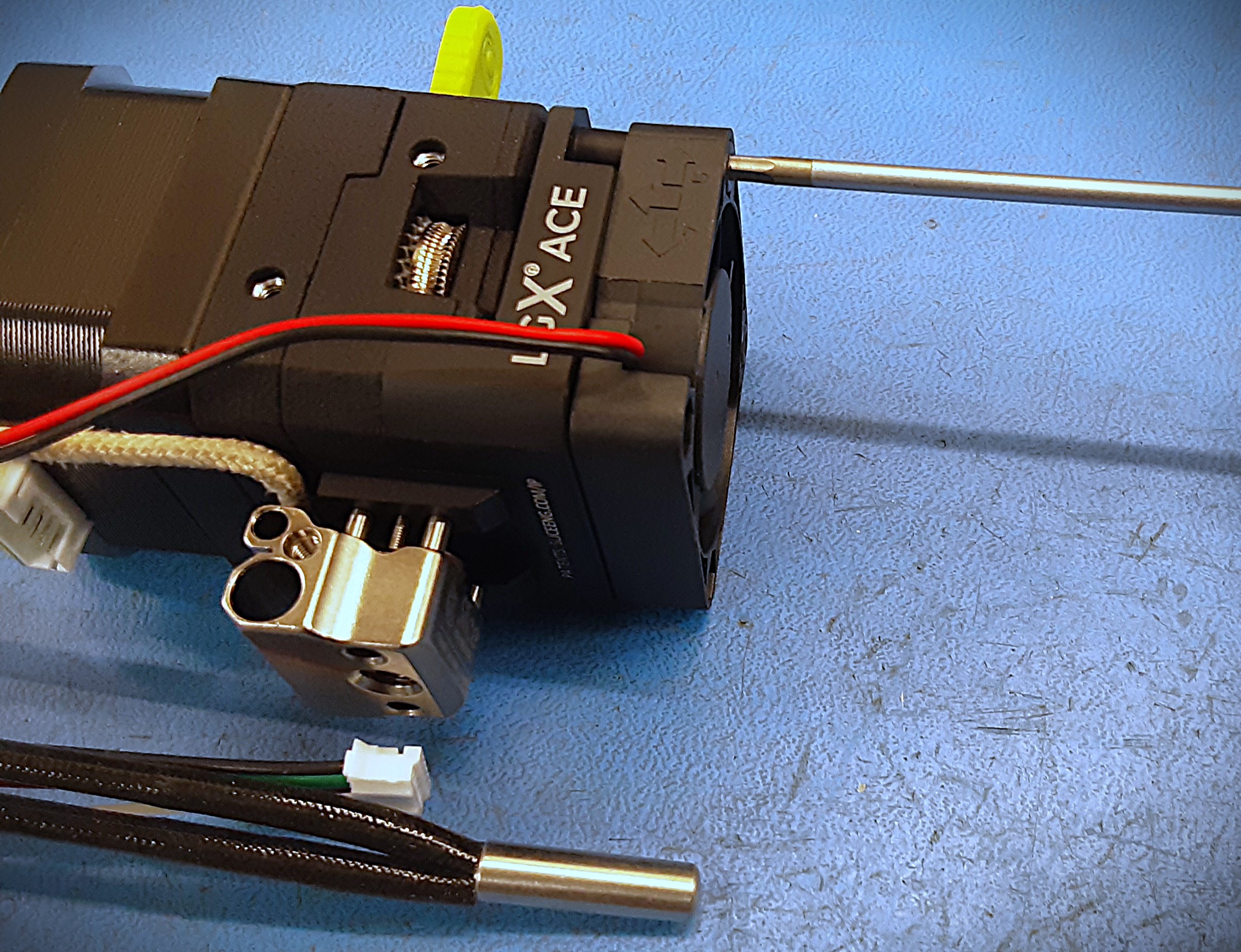 4E) Grab 1x EL-TH0012. Insert the heater cartridge from AS-CB0209 and EL-TH0012 into the hot block and secure using one #1 screw from HD-MS0100.